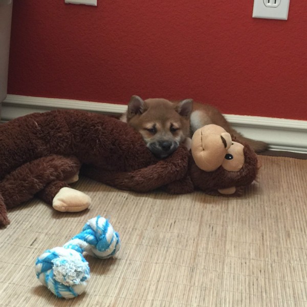 Then we took her home and introduced her to some of her new toys. She has taken an instant love-ing to her monkey and still attaches herself to monkey every night in her crate.